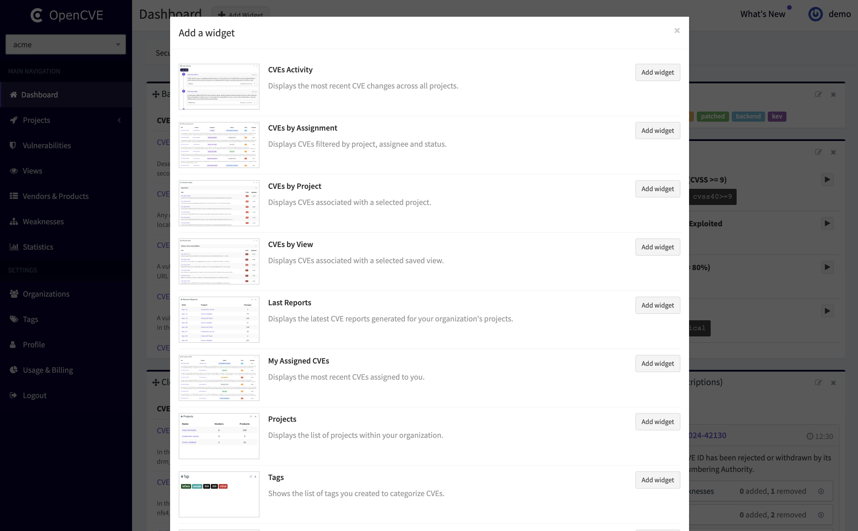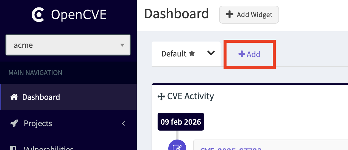 By default, each organization has a default dashboard. Users can create additional dashboards to better organize their widgets (e.g. one for high-priority CVEs, one per project, or one for daily reports).