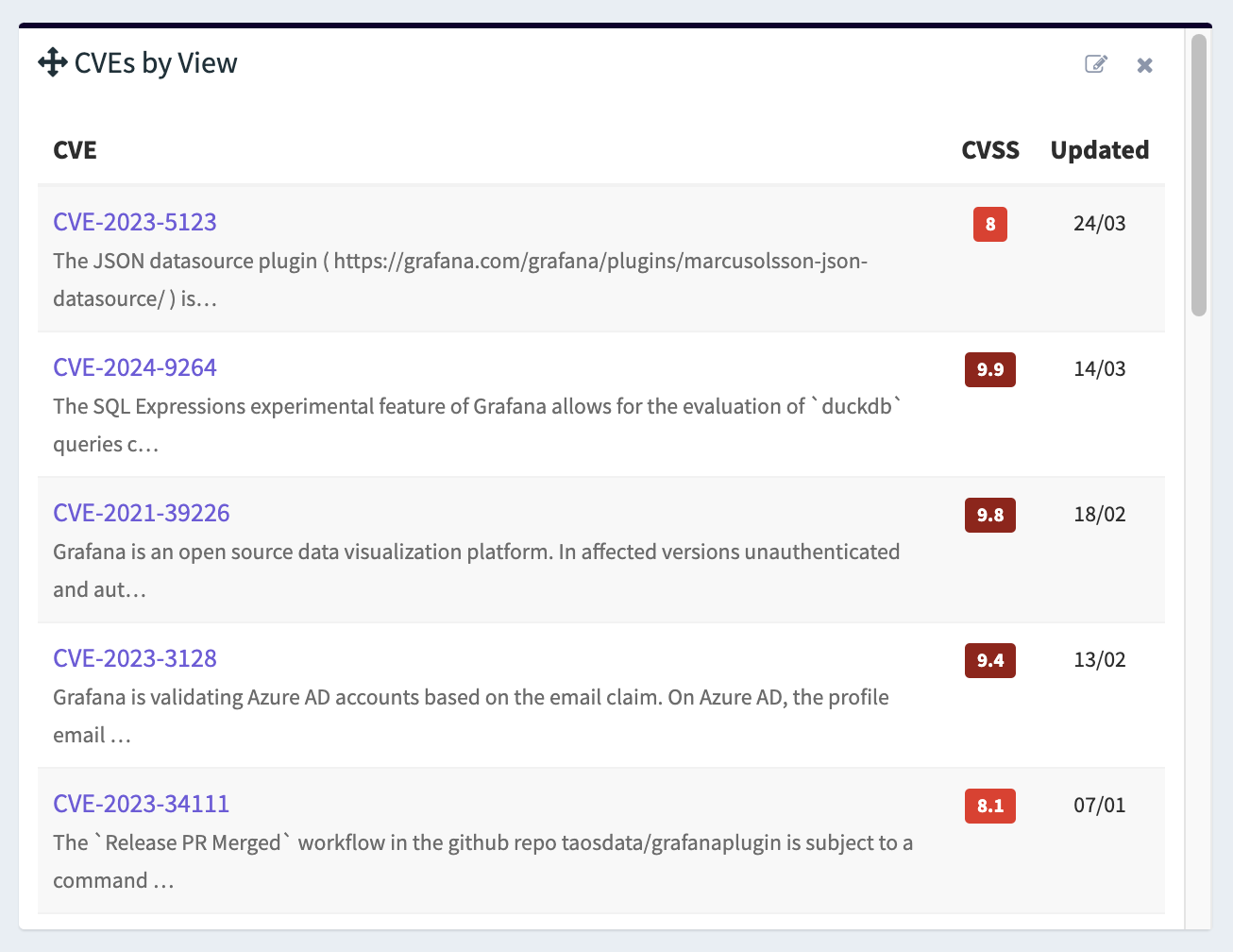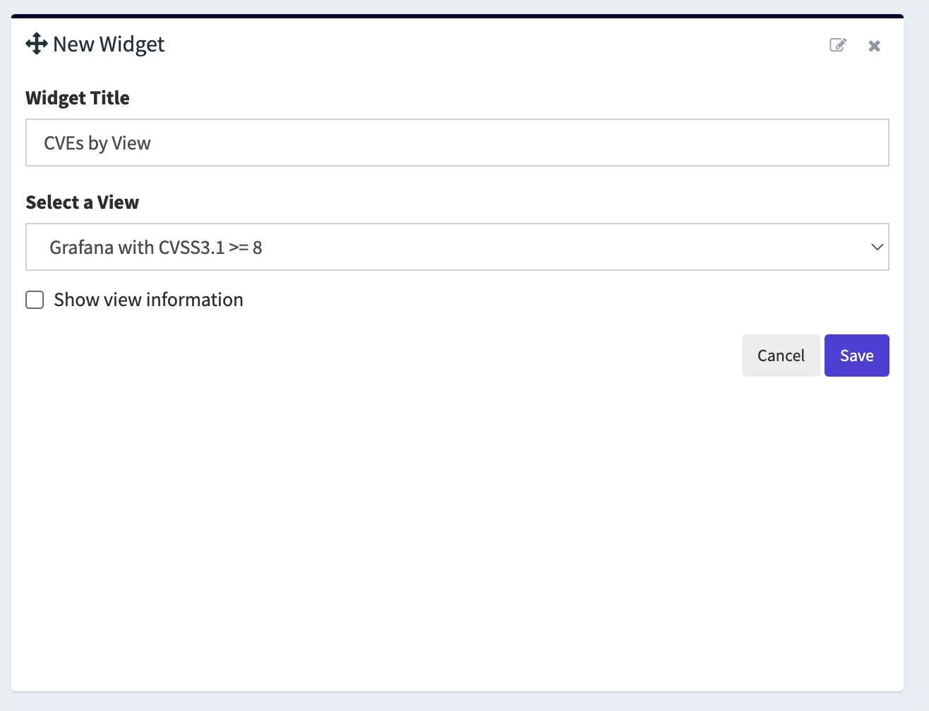This view can then be added as a widget to your dashboard with the CVEs by View widget.
