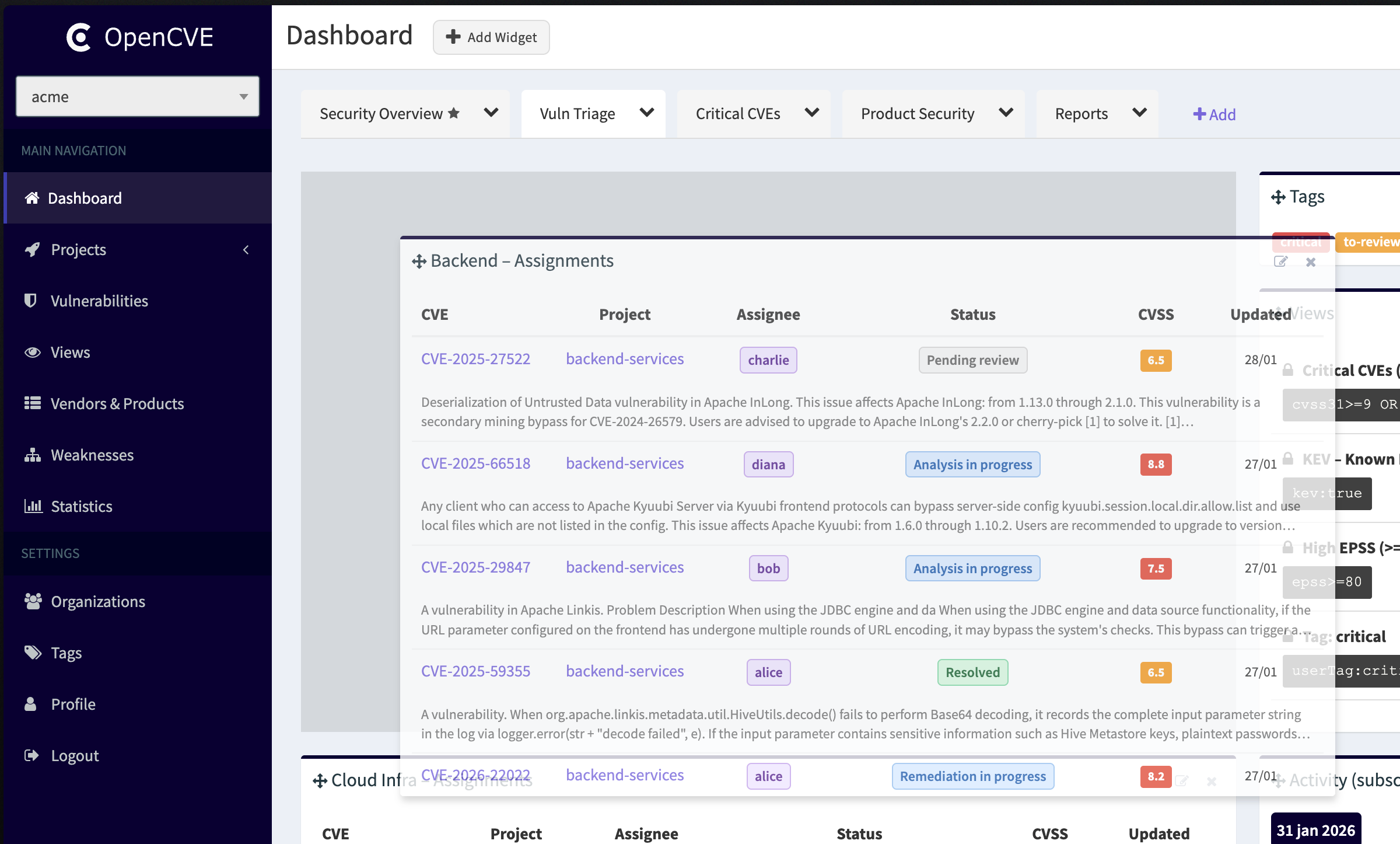 - Track the progress of vulnerability management workflows: assign CVEs to users per project, set their status (e.g., analysis, risk acceptance), and use custom tags (e.g.,