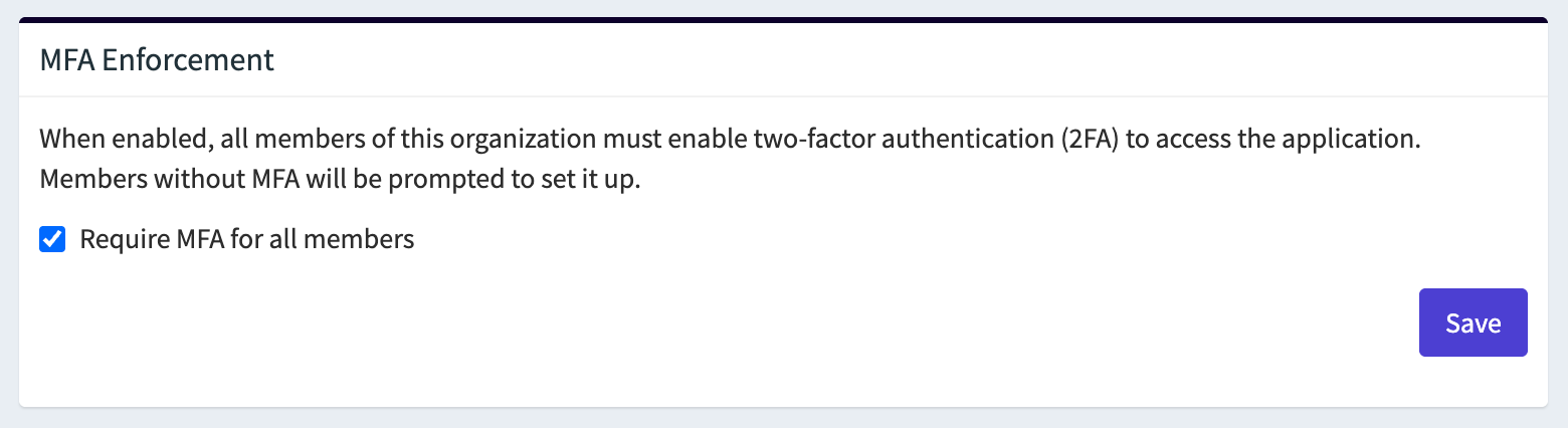 - In the MFA Enforcement section, enable Require MFA for all members.